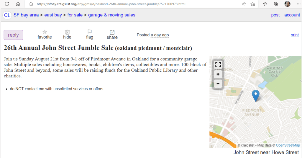 John Street Jumble Sunday August 21 from 9AM to 1PM On August 18, 2022 By Joe JohnstonIn Piedmont Ave Neighborhood Share this: Click to share on X (Opens in new window) X Click to share on Facebook (Opens in new window) Facebook Like Loading... Related