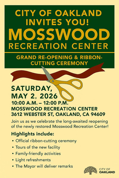 Grand Re-Opening of the Mosswood Recreation Center Saturday May 2 from 10AM to 12:00PM On April 21, 2026 By Joe JohnstonIn Mosswood Park, Neighborhood Events Share this: Share on X (Opens in new window) X Share on Facebook (Opens in new window) Facebook Like Loading... Related