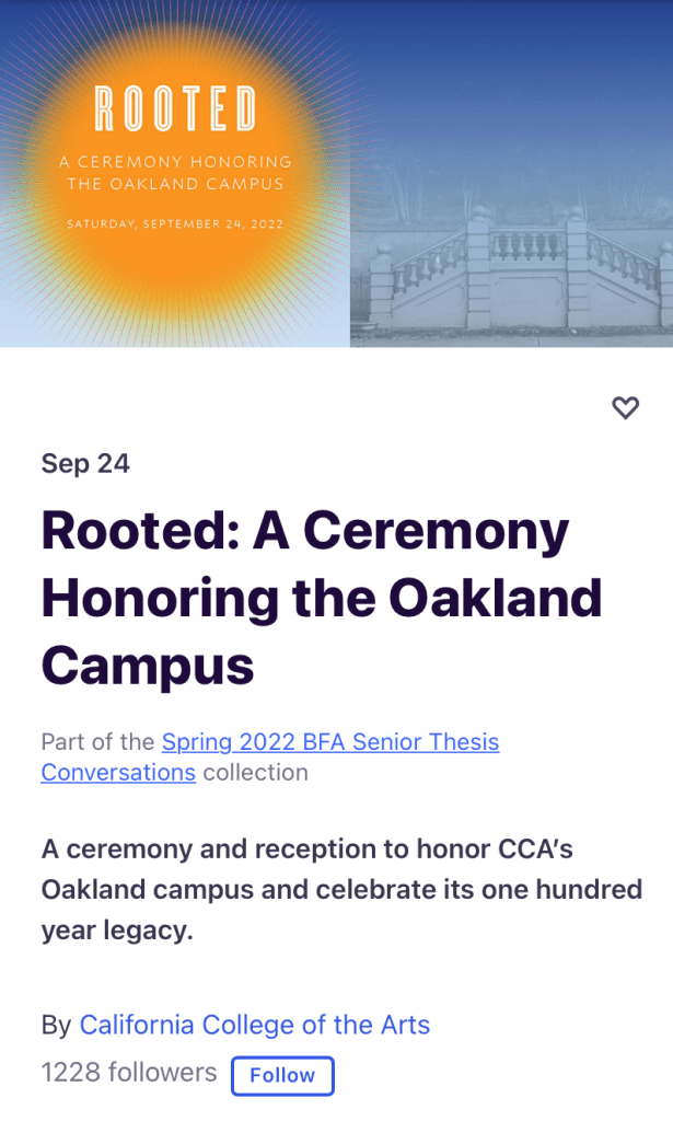 Please join the Oakland Campus Legacy Committee for a ceremony honoring CCA’s Oakland campus. We come together to show gratitude to the beloved garden campus we have called home for one hundred years and celebrate the roots we carry forward for centuries to come.