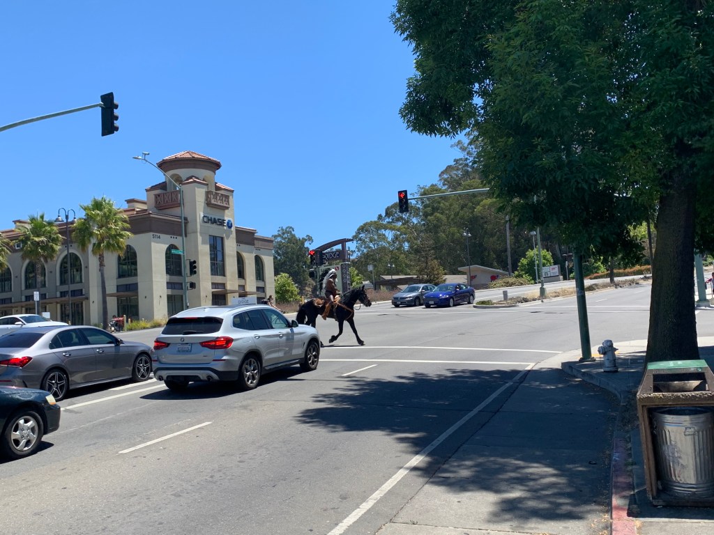 Horseman on Gilbert St crossing Whitmore St. A man can be heard exclaiming “I’m sending that (a photo of the horseman) to everyone I know!”